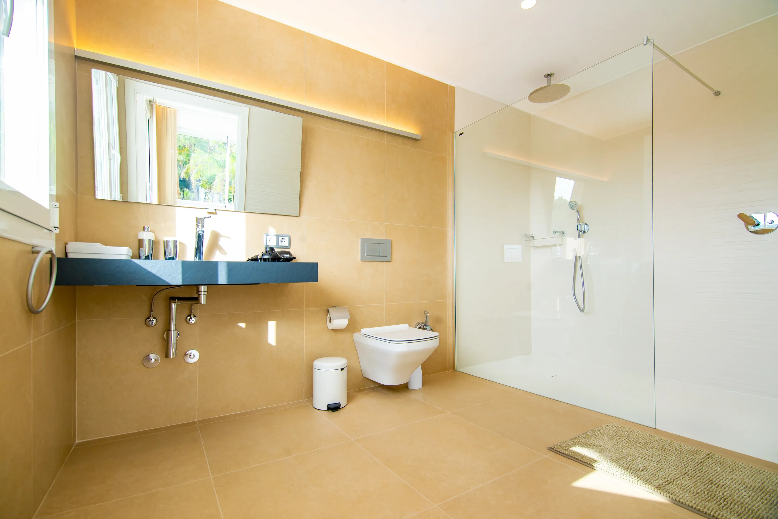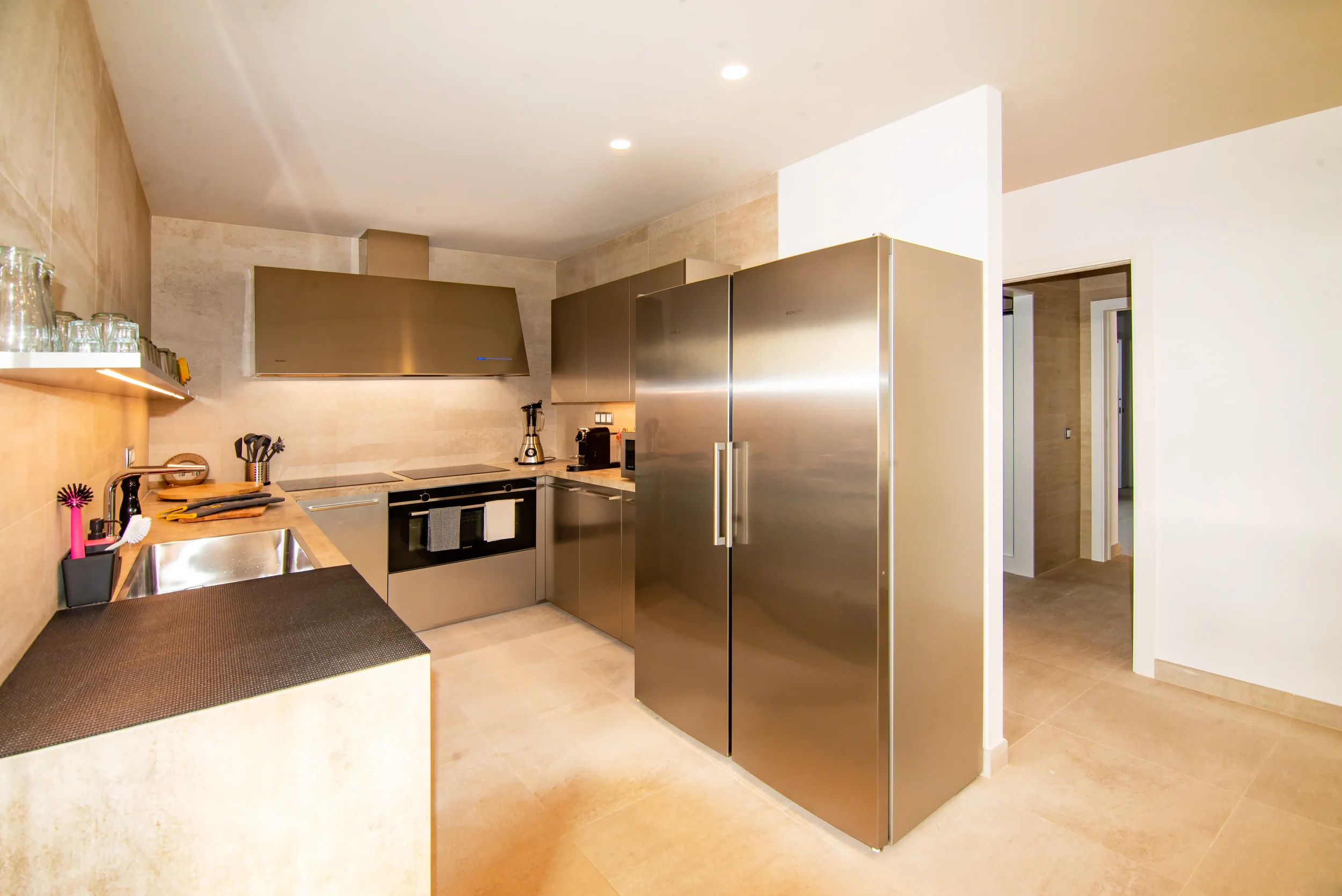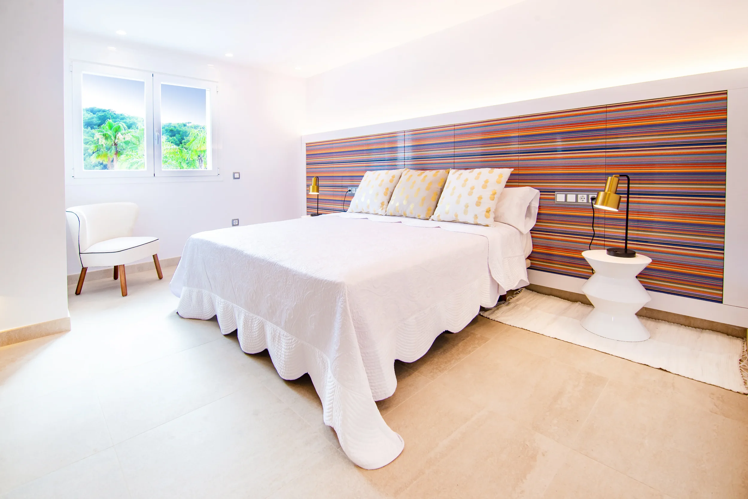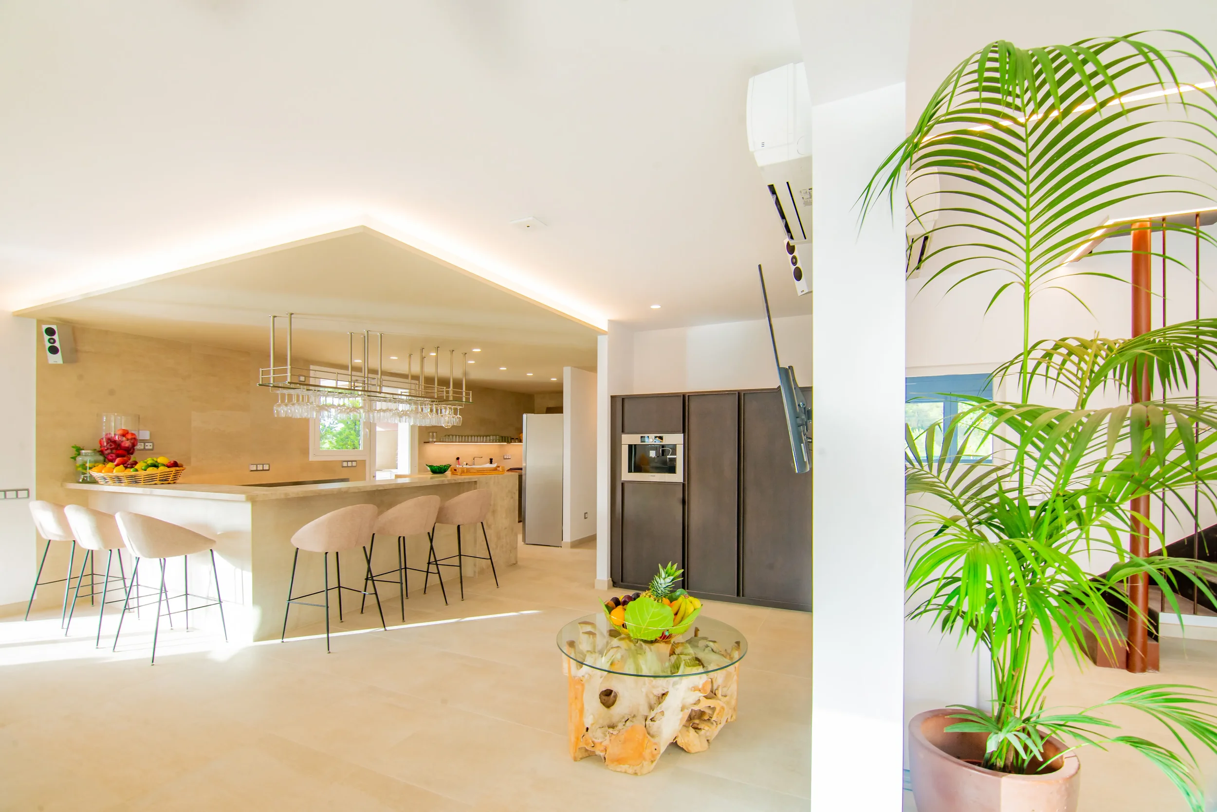 The villa’s interiors are bright and modern, filled with handpicked details and plenty of natural light. Inside, you’ll find two grand suites with private terraces, several additional bedrooms with en-suite bathrooms, and a guest apartment with two more bedrooms and a full kitchen, perfect for hosting with privacy.