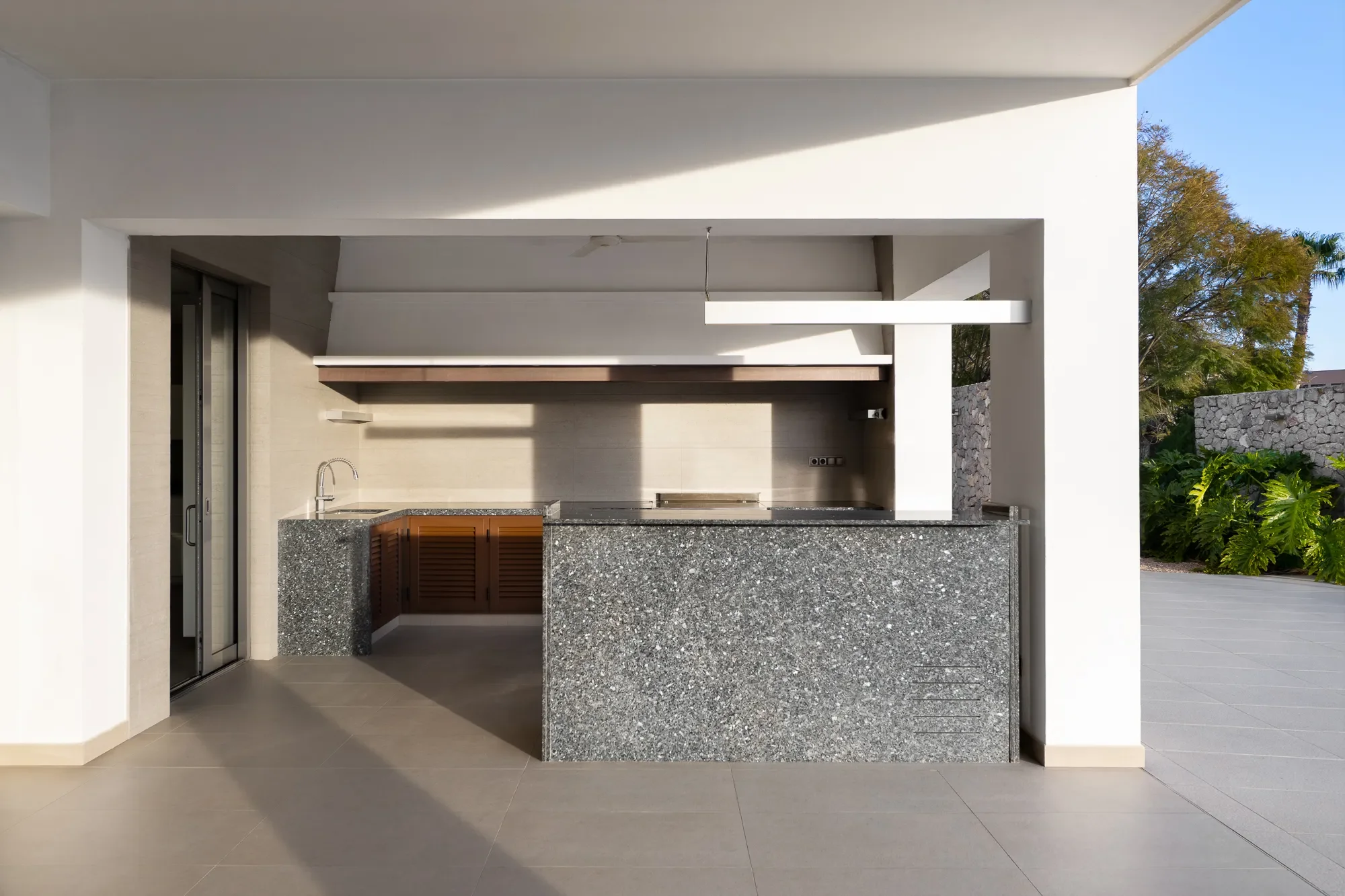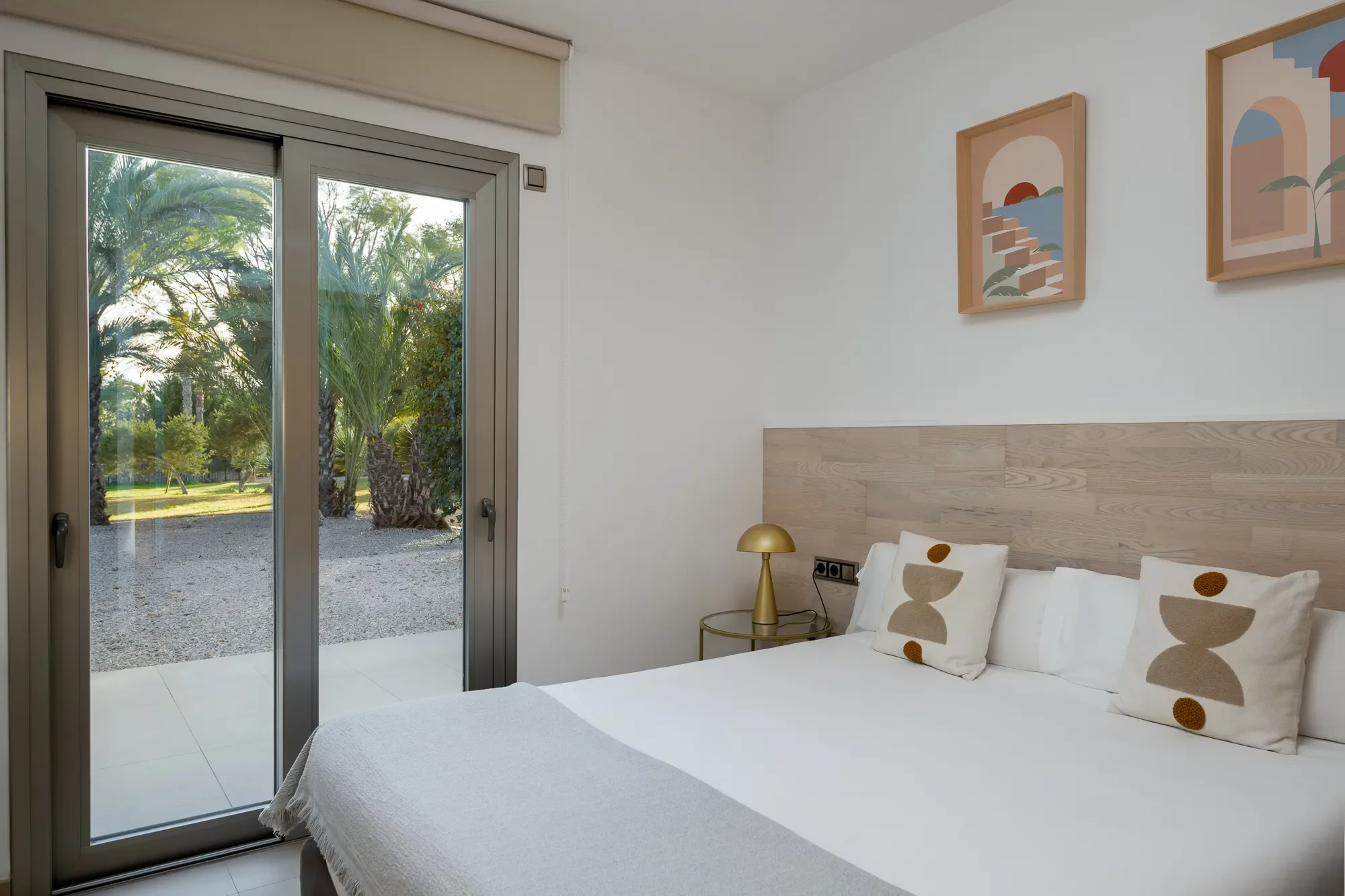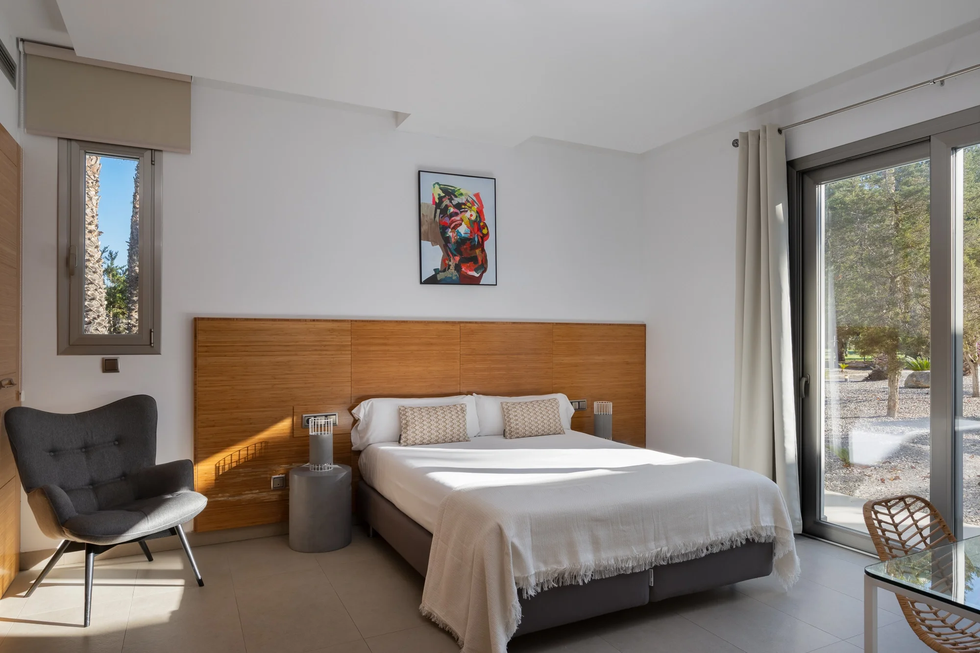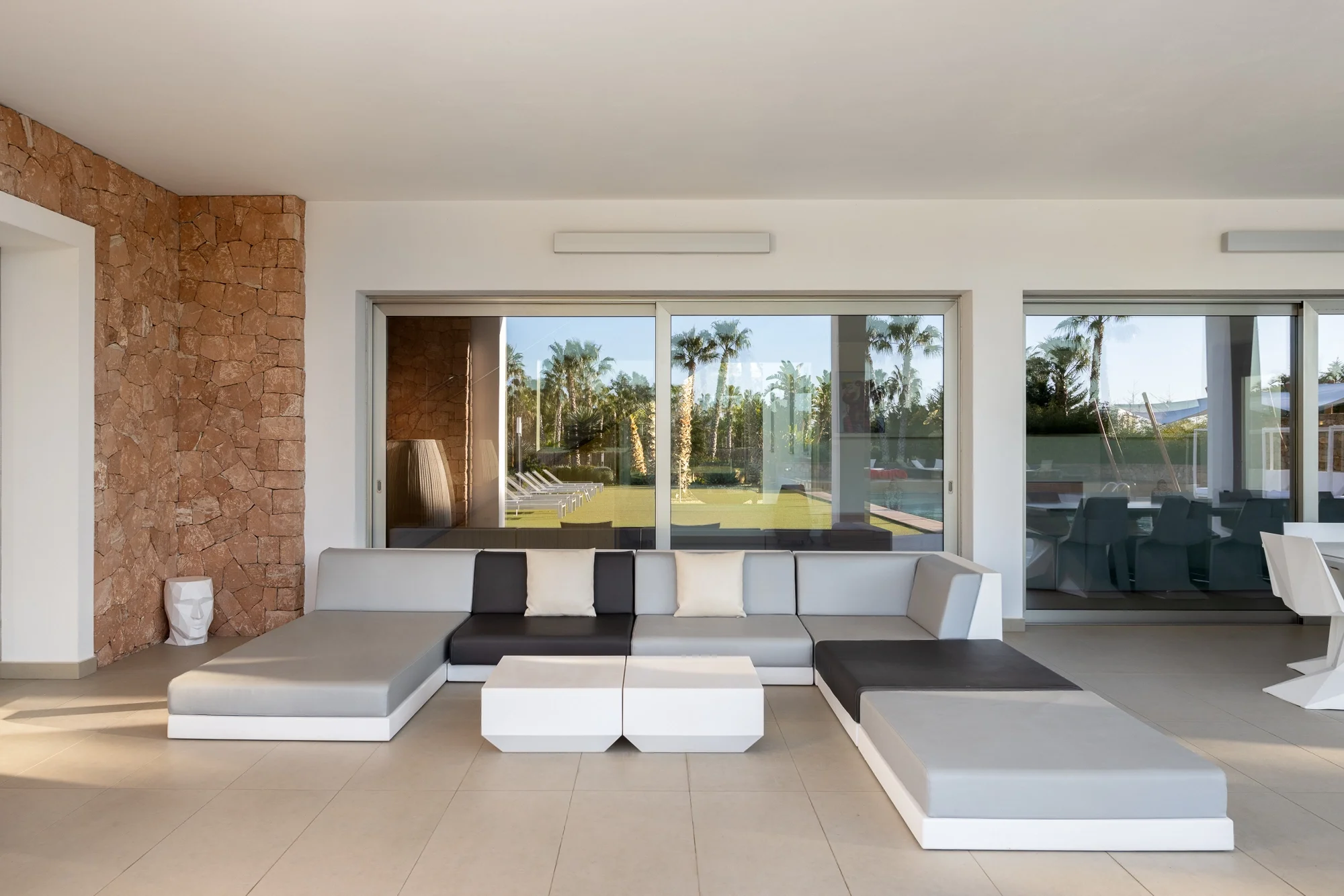 The main villa sleeps up to 16 guests and features five spacious bedrooms, including a master suite with private terrace and jacuzzi bath. A separate guest apartment adds two more bedrooms and a fully equipped kitchen, perfect for extra guests or staff. Floor-to-ceiling windows and natural tones bring a sense of calm, while the layout keeps indoor and outdoor living perfectly connected.