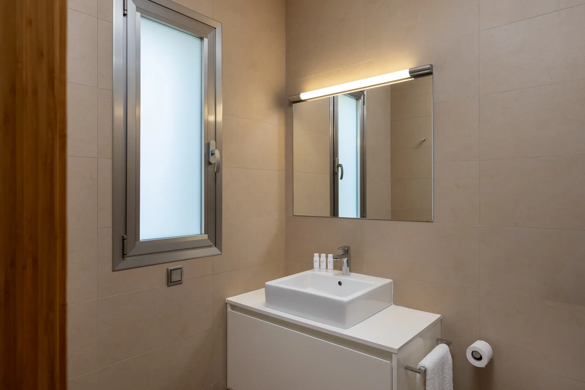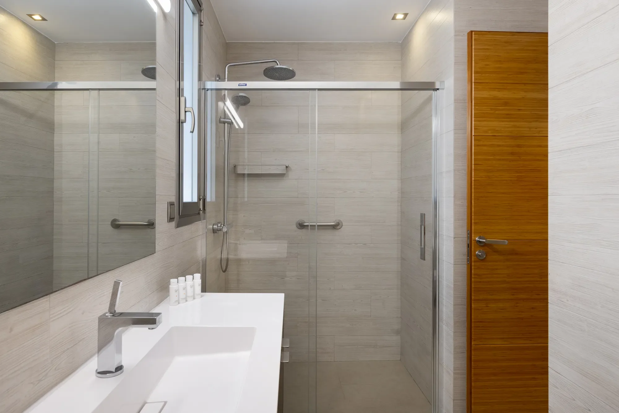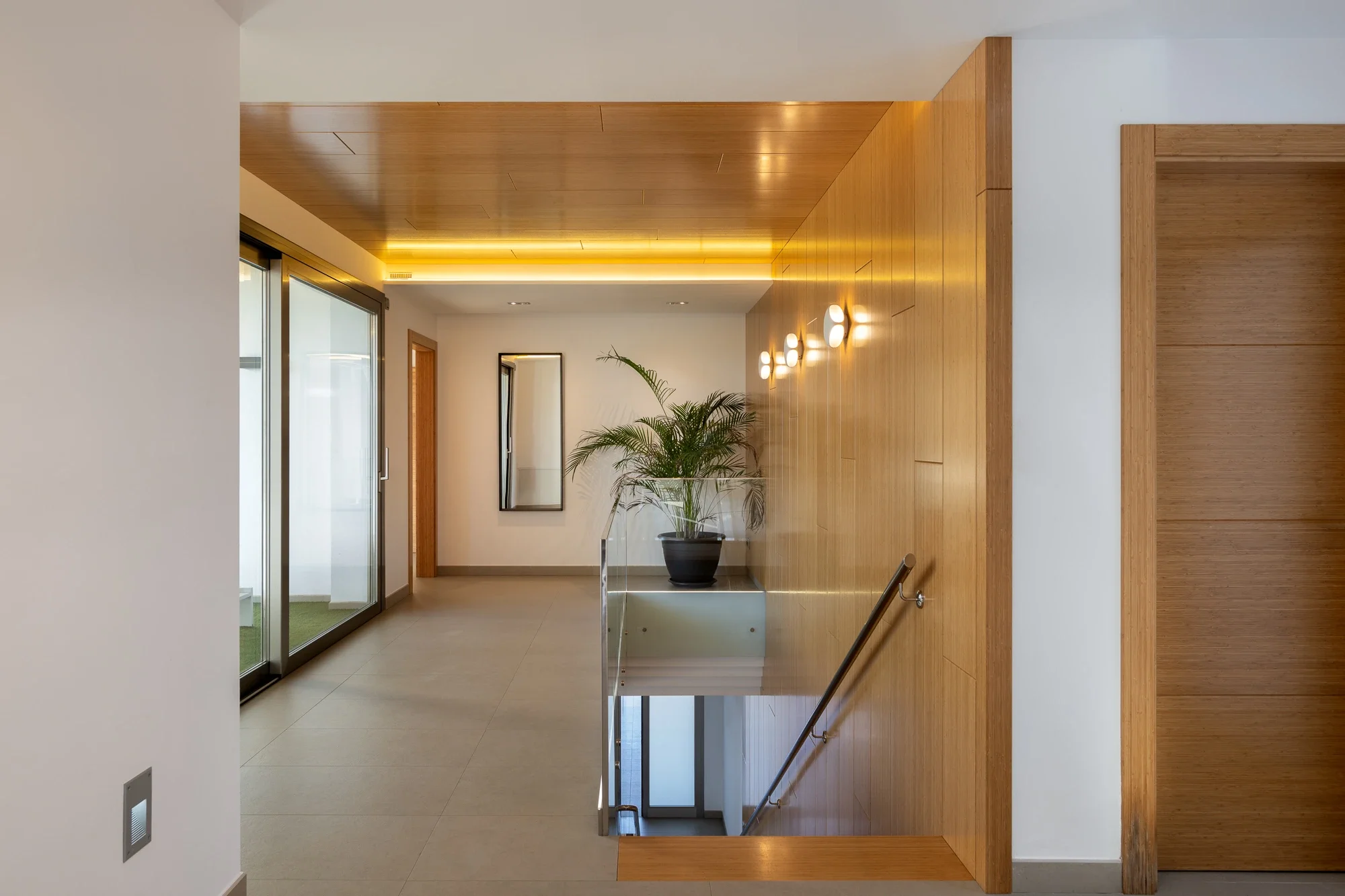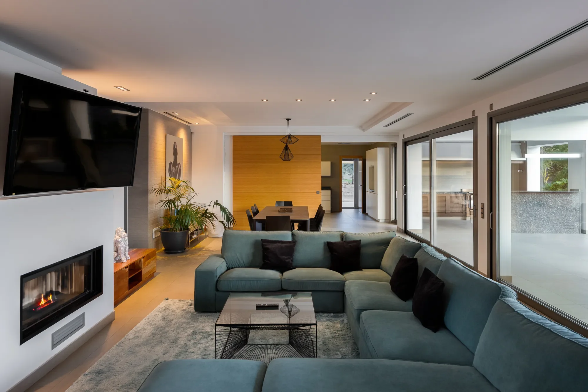 The main villa sleeps up to 16 guests and features five spacious bedrooms, including a master suite with private terrace and jacuzzi bath. A separate guest apartment adds two more bedrooms and a fully equipped kitchen, perfect for extra guests or staff. Floor-to-ceiling windows and natural tones bring a sense of calm, while the layout keeps indoor and outdoor living perfectly connected.