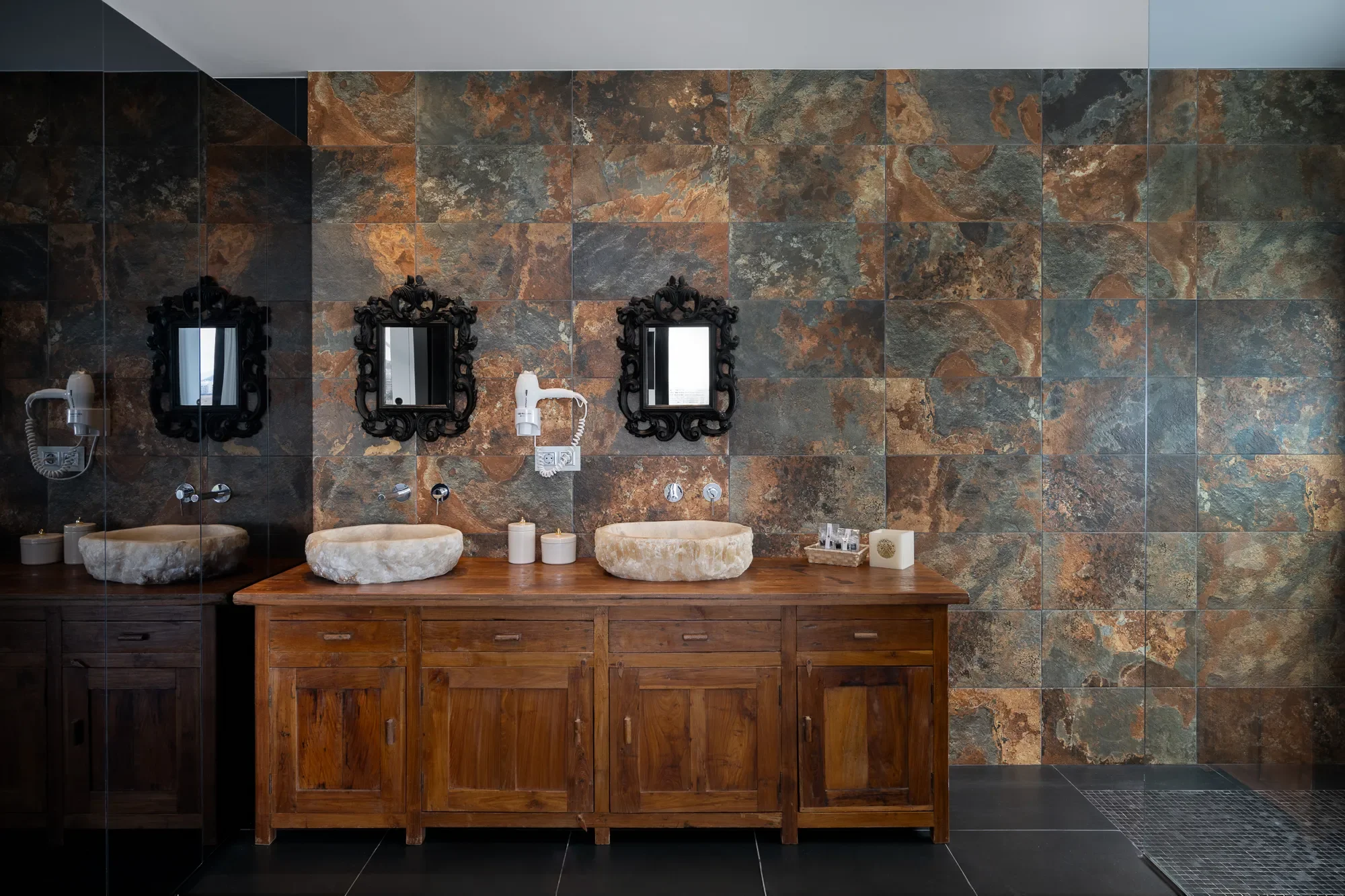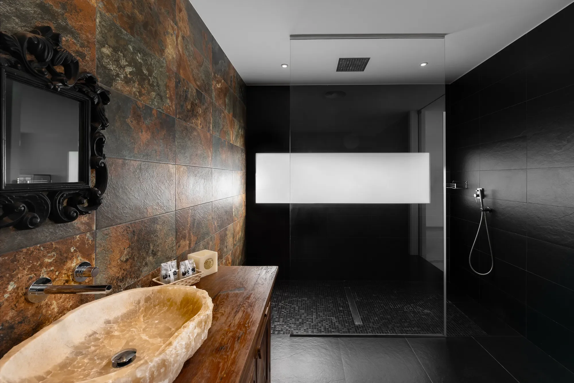 Villa Valeria hosts up to 12 guests across six luxurious suites, including a presidential suite with private terrace and sweeping sea views. Two grand suites feature oversized windows framing the natural surroundings, while three additional suites provide both privacy and comfort, all with en-suite bathrooms.