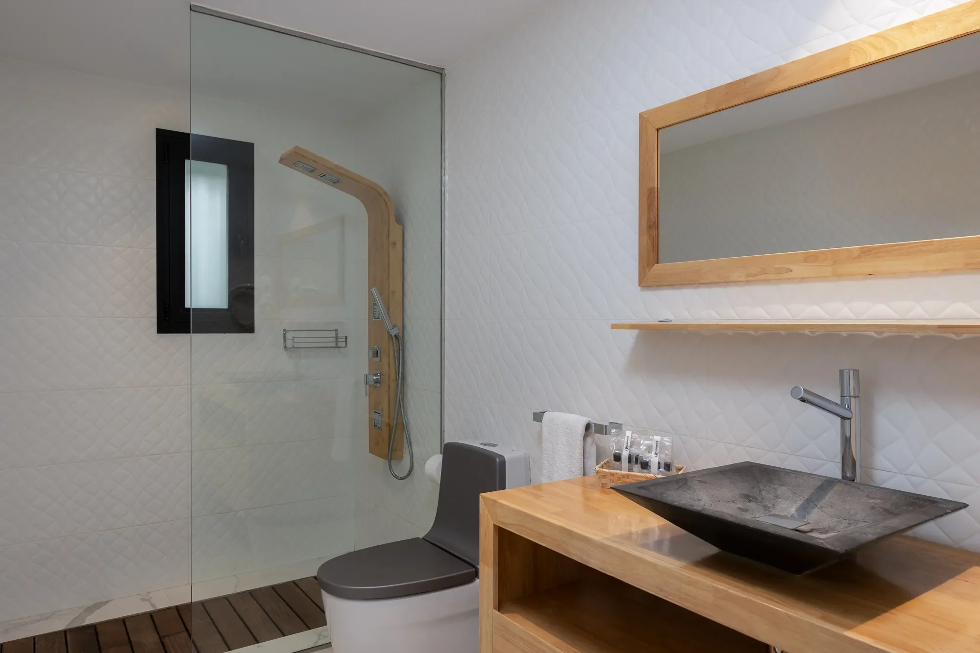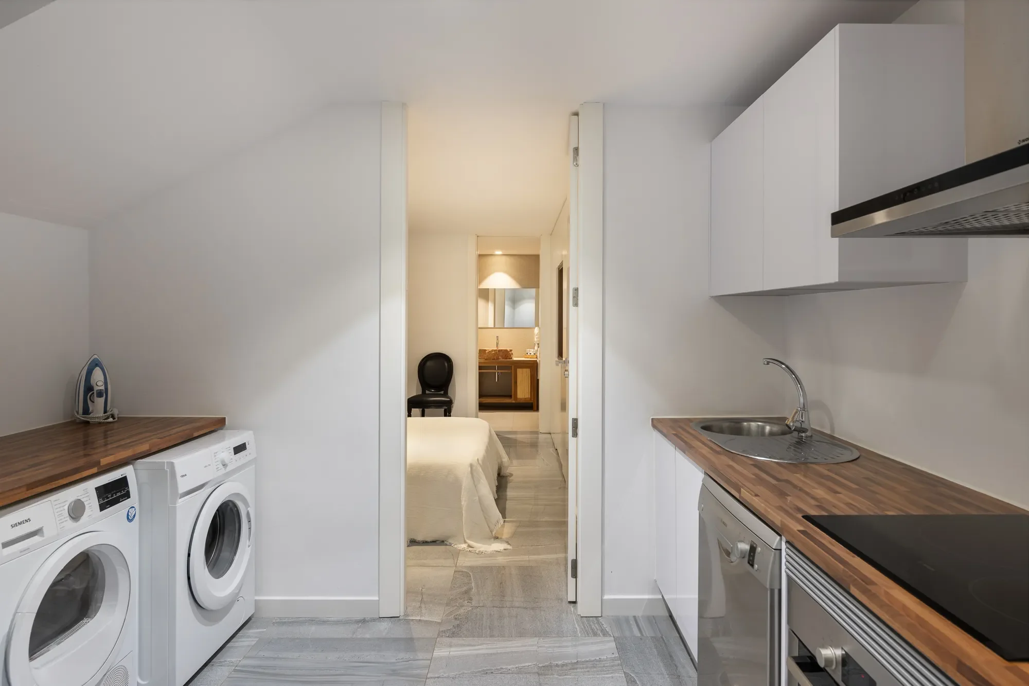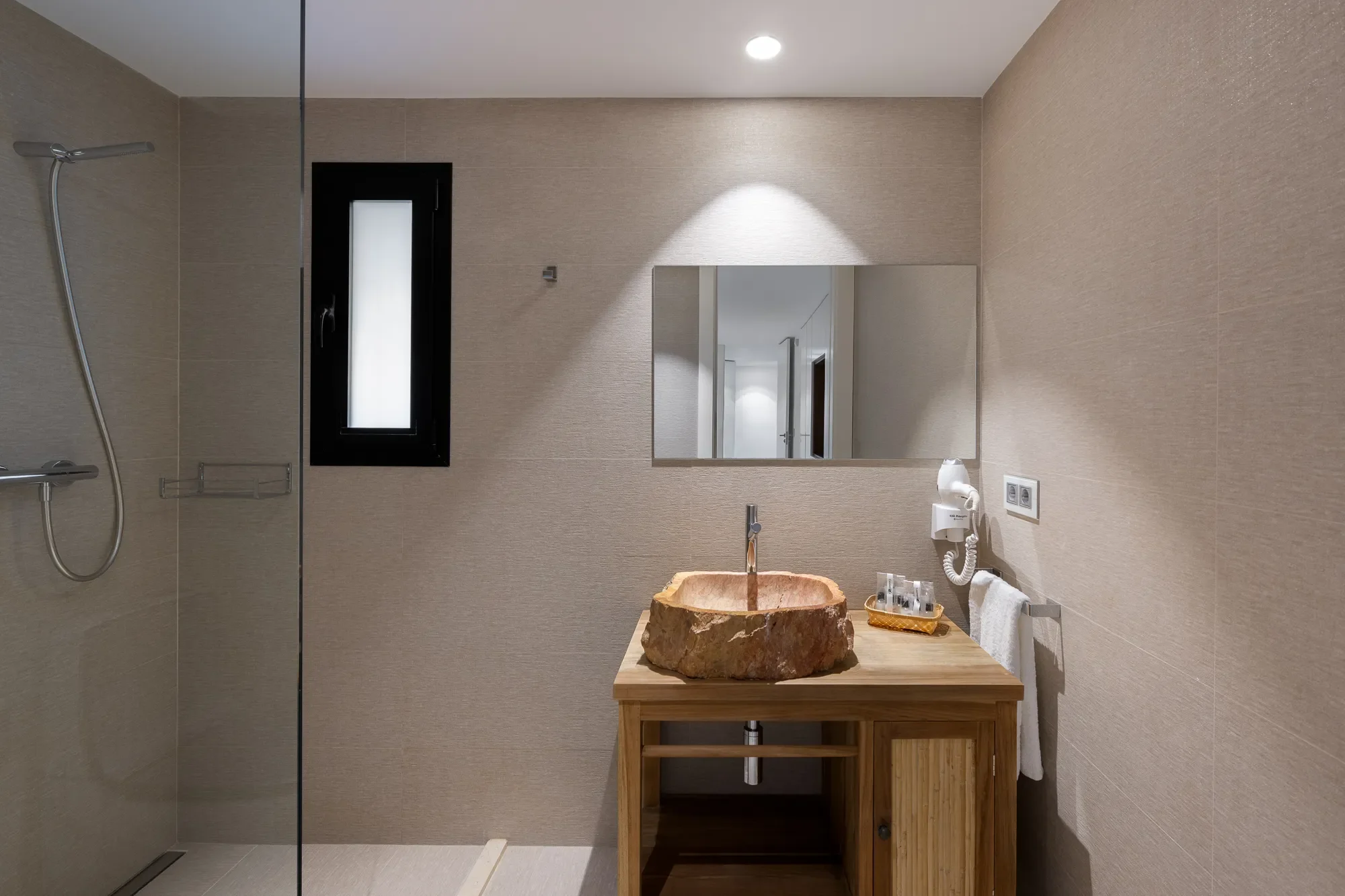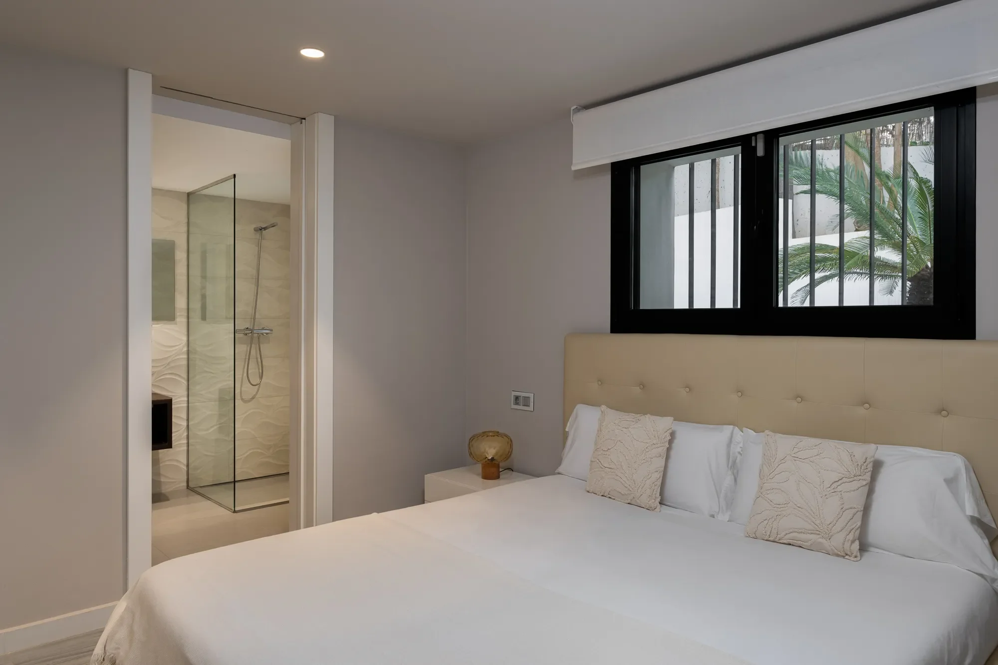 Natural light floods the interiors, highlighting warm tones and minimalist design throughout. The spaces are clean, calming, and full of character, reflecting the effortless charm of the island.