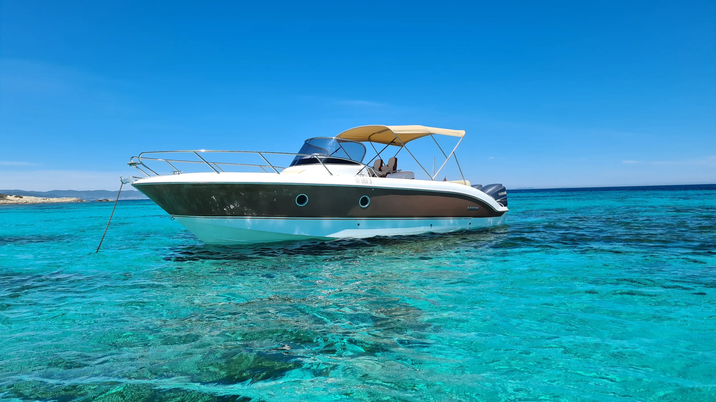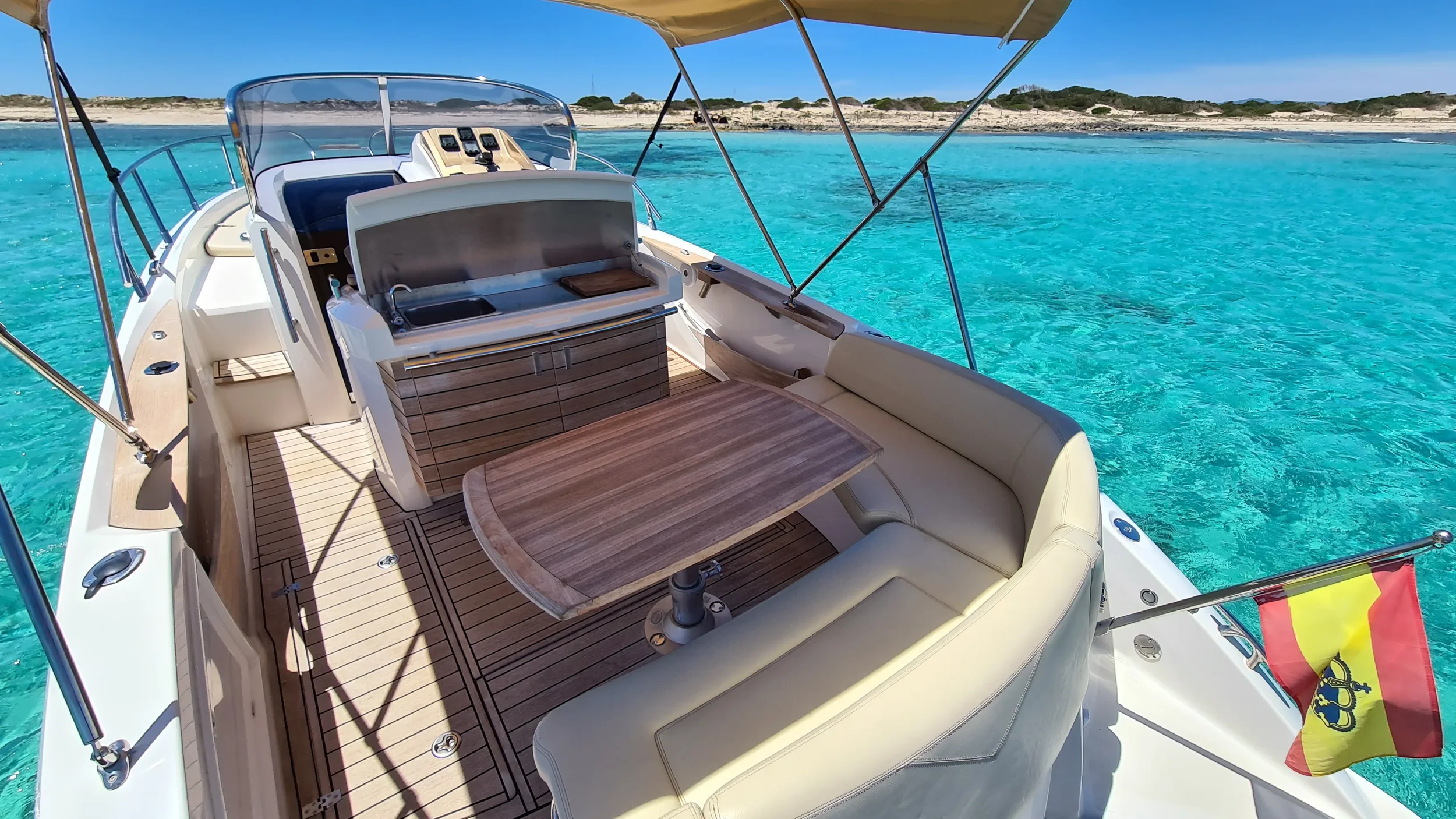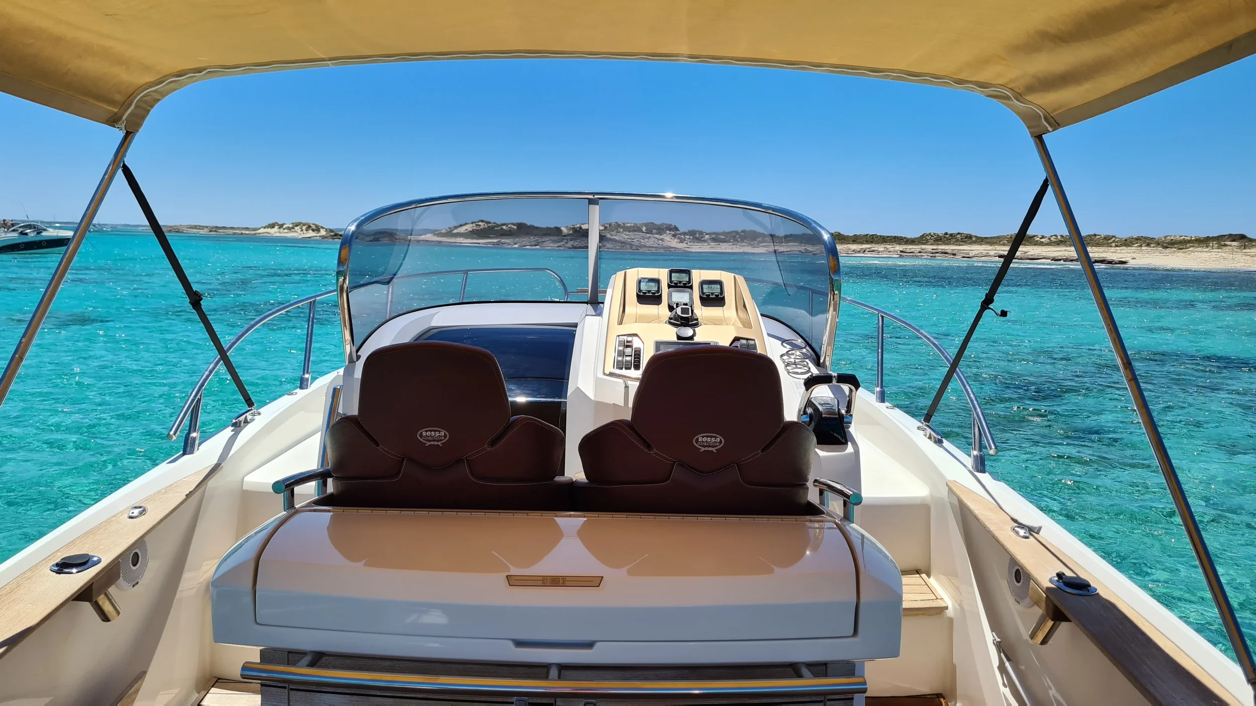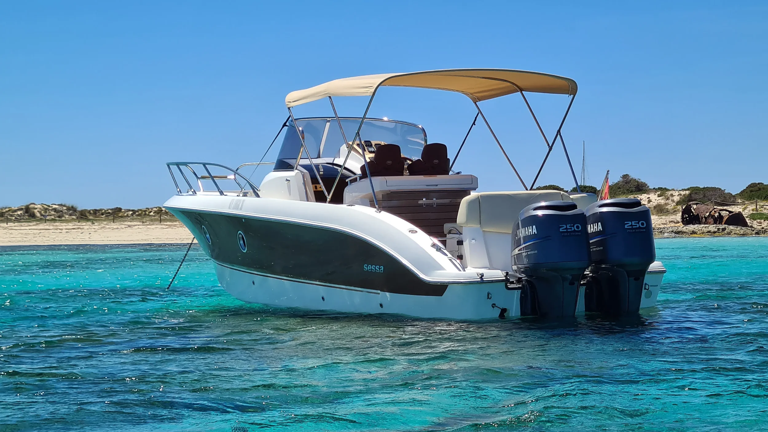 The Sessa Key Largo 30 Mahi Mahi is a comfortable and inviting day boat designed for relaxed cruising around Ibiza and Formentera. With its wide sun deck, generous seating areas and clean modern layout, it offers an easy, open and enjoyable environment for guests who want to spend a carefree day on the Mediterranean. Recently refreshed with new exterior paint and updated flooring, the boat feels bright, modern and perfectly suited to Ibiza’s coastline.